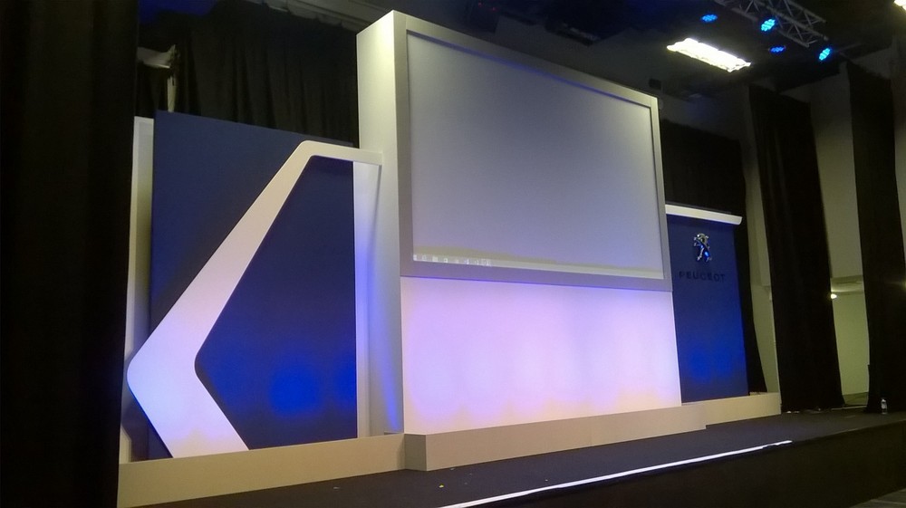 The home of British motor racing, Silverstone, was the venue for the Peugeot/Citroen Regional Aftersales Conference. Set panels and screen surround were built and covered in white canvas with the screen surround covered in felt, cantilevered screen surround was built into the main set. Installation and removal of set completed in one day.