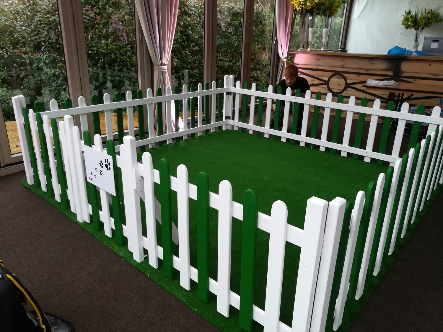 A 'puppy play pen' was requested for an exclusive birthday party in a boutique hotel in Hurley, Berkshire. SCG manufactured, installed and removed the 12m white picket fence and fake grass.